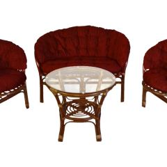 Комплект из натурального ротанга, состоящий из дивана, двух кресел и круглого столика со стеклом.